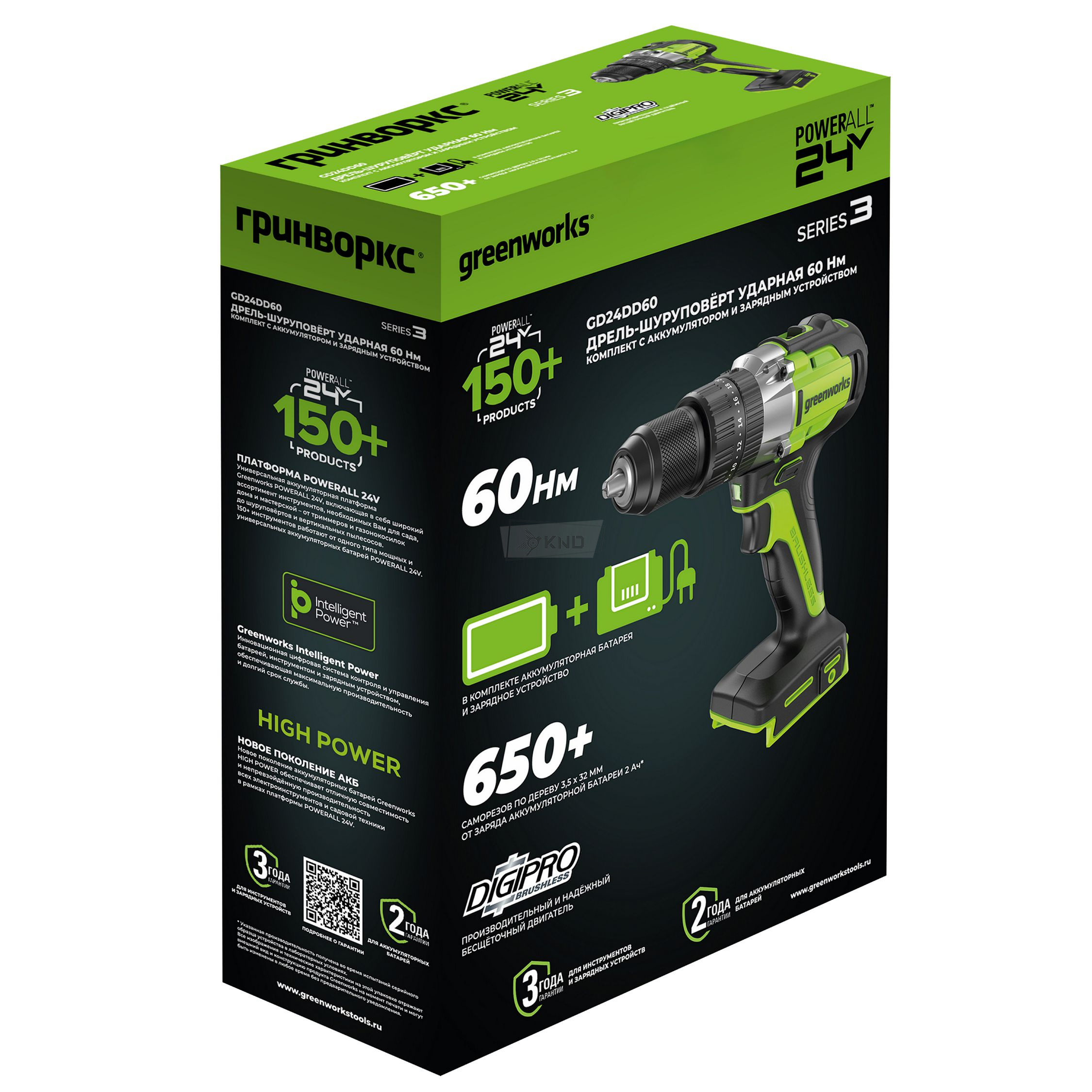 Дрель-шуруповерт аккумуляторная Greenworks GD24DD60 с АКБ 2 Ач и ЗУ